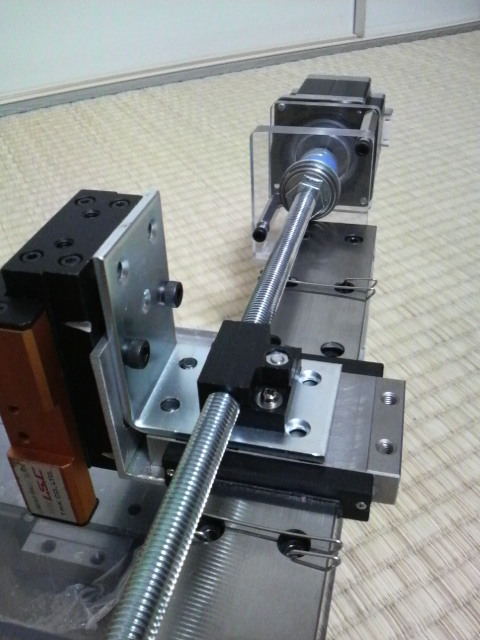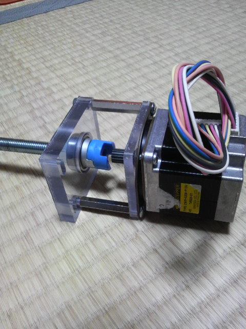 前回のと同様に深溝ベアリングのサンドイッチ構造で軸受けをしつつ、ダブルナットのうち片方をカップリングにすることで簡略化しています。